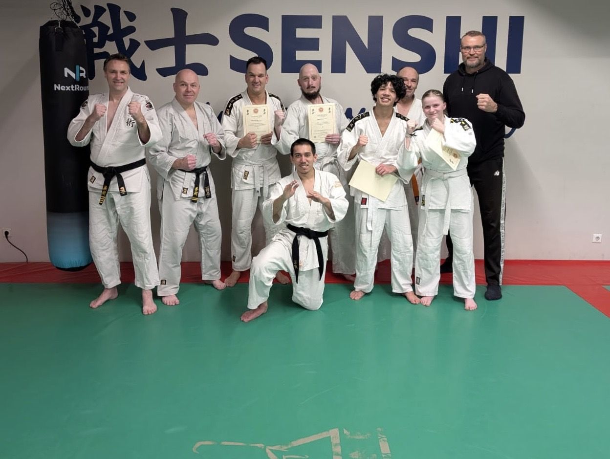 Het examen duurde maar liefst twee uur en omvatte een breed scala aan technieken – van stoten en trappen tot bevrijdingen, klemmen, worpen en controletechnieken.